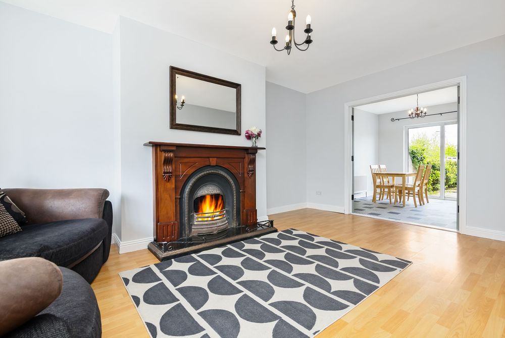 Laminate flooring. Feature bay window. Open fire. Double doors to dining area.