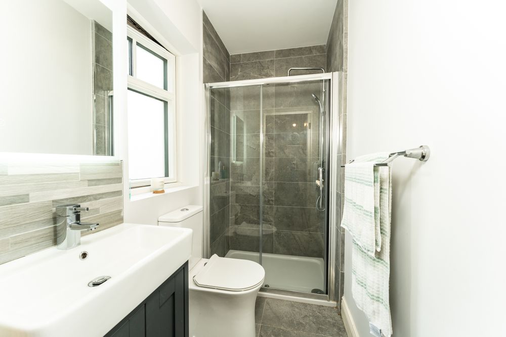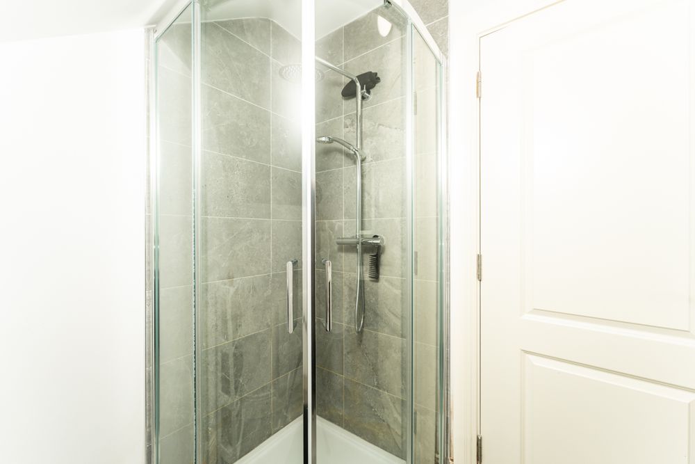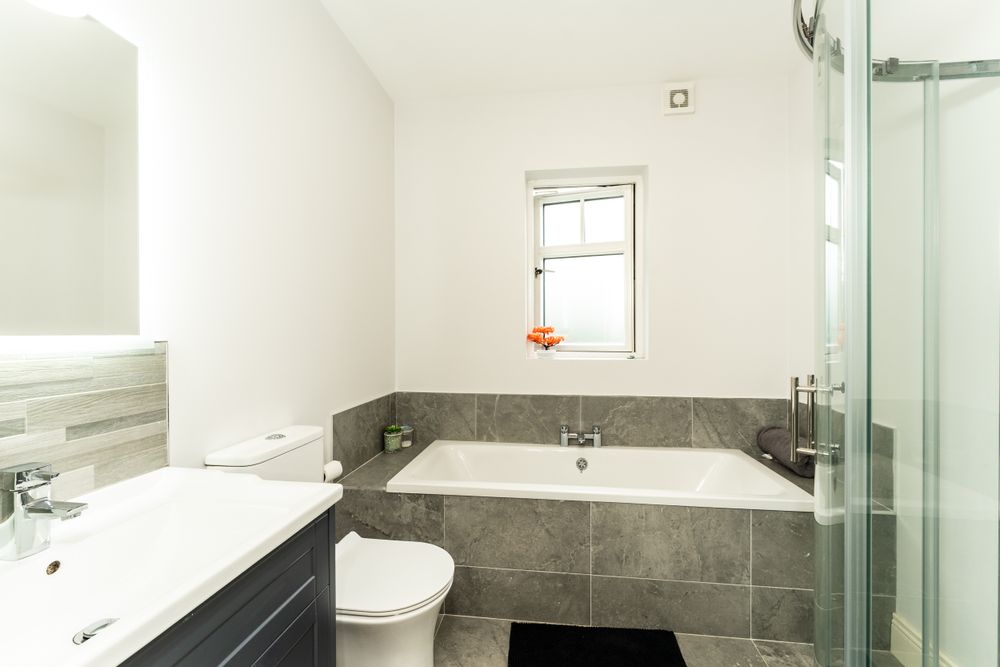 Tiled flooring and shower enclosure, pump shower, bath and tiled enclosure, toilet, sink and vanity unit