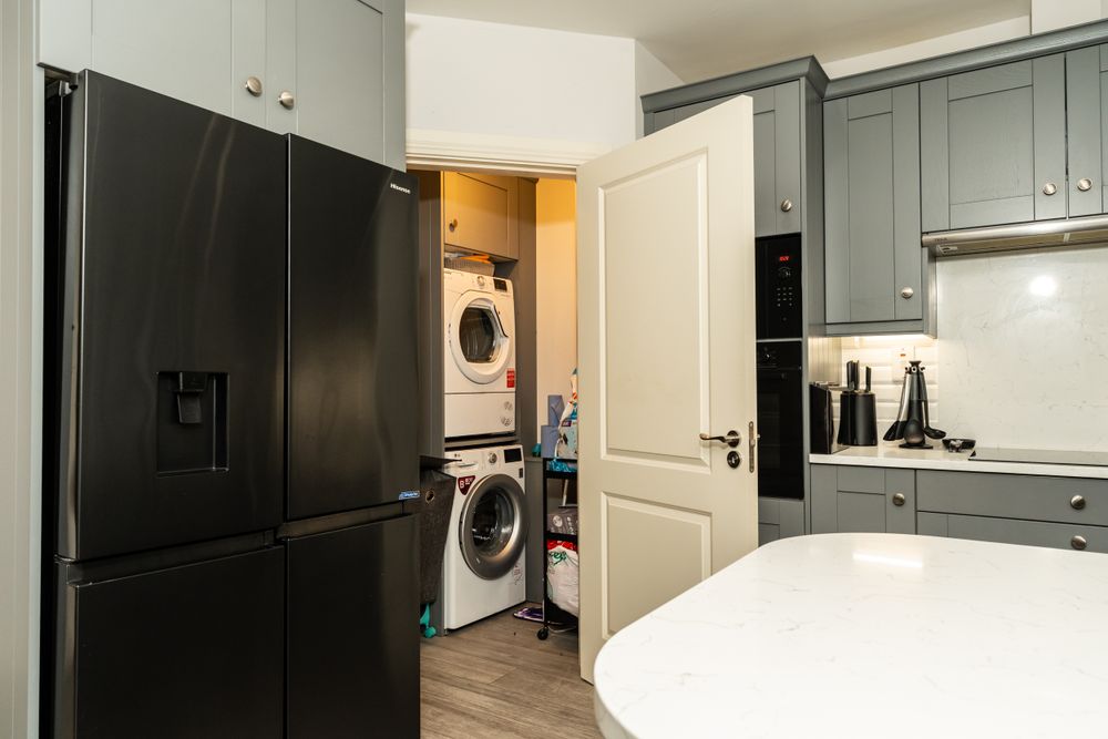 Porcelain Tiles, plumbed for washing machine and tumble dryer, built in storage