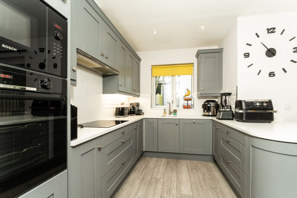 Porcelain Tiles, Fitted kitchen units, oven, hob & hood, tiled splashback, integrated dishwasher, quartz countertop, and peninsula, patio doors onto south facing rear patio