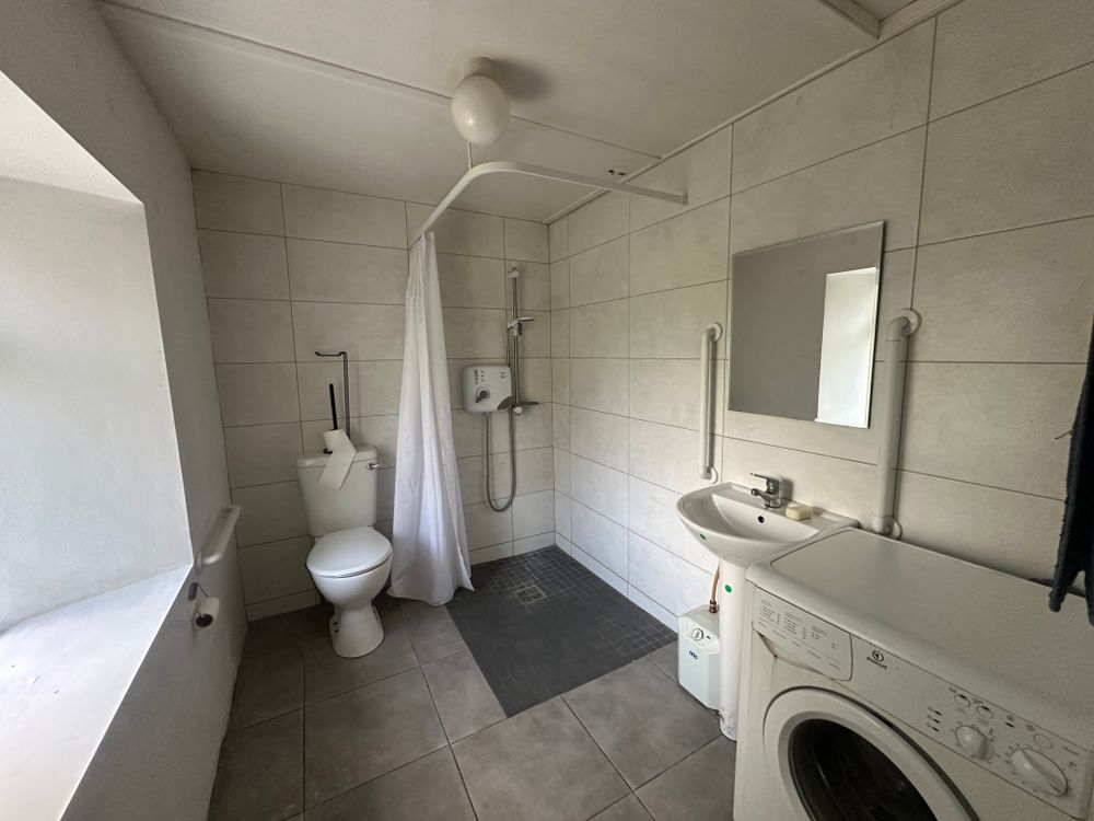Wall to ceiling tiled, Wc, whb, disabled accessible shower, plumbed for washing machine