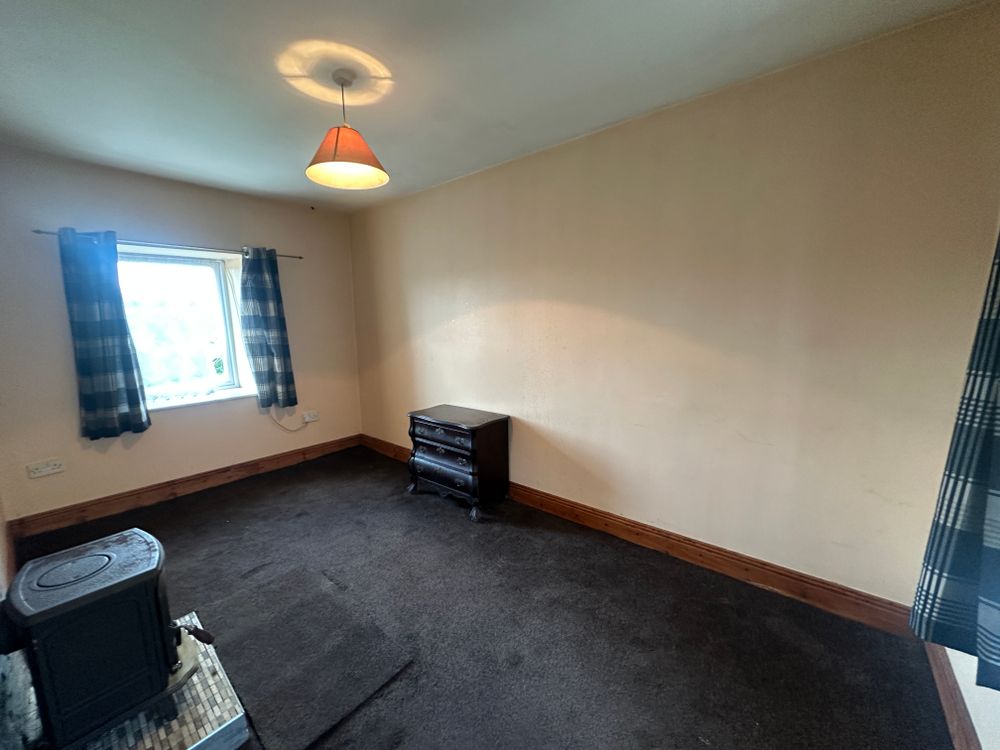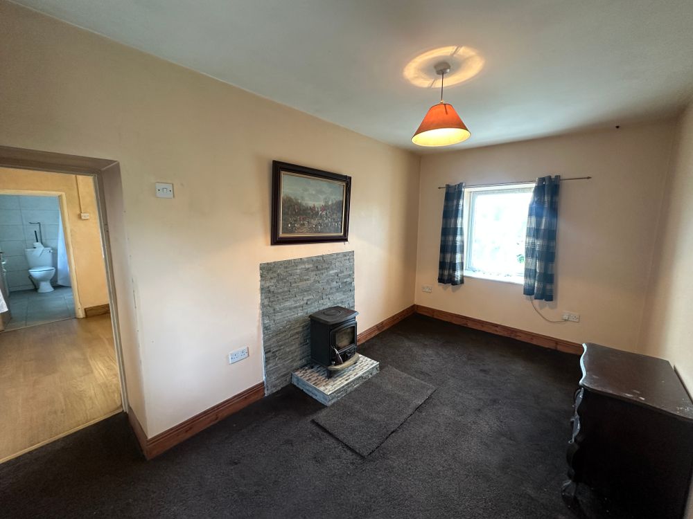 Sitting room/Bedroom one- fitted carpet, solid fuel stove with stone effect surround, dual aspect windows