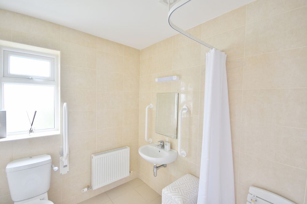 Wetroom. Fully tiled.Triton power shower. WC. Wash handbasin. Wheelchair/disability friendly with grab rails and foldable shower seat.