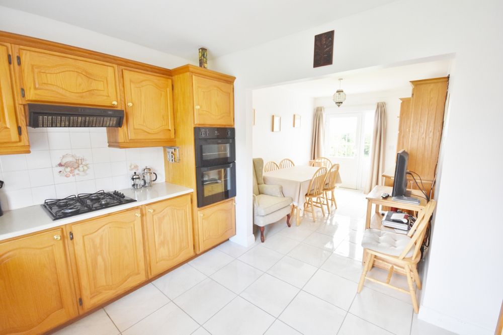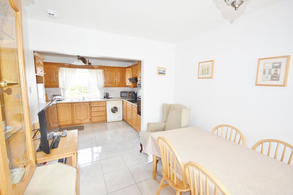 Tiled flooring. Oak fitted kitchen units. Double sink. Gas hob. Extractor fan. Double oven. Washing machine. Fridge freezer. Tiled splashback. Oil burner. Fitted units/dresser in dining area. PVC door leading to south-facing rear garden.