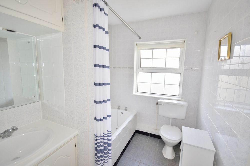 Fully tiled. Bath with Triton T90SI power shower. WC. Wash handbasin. Storage presses.
