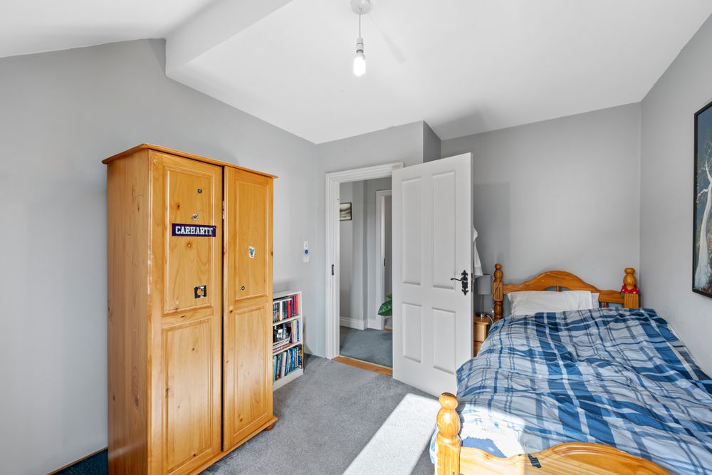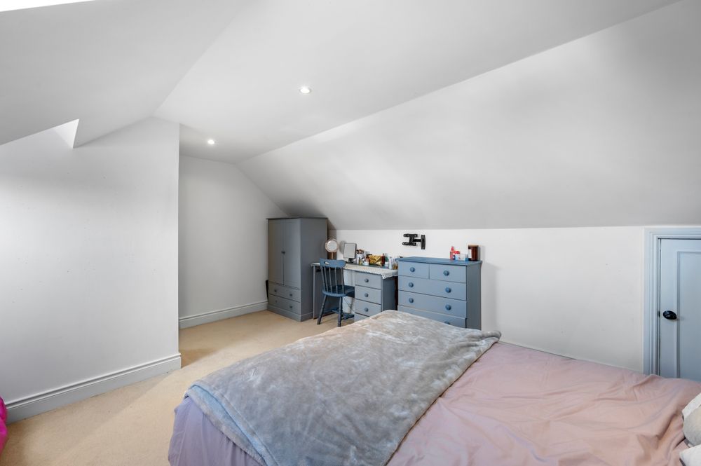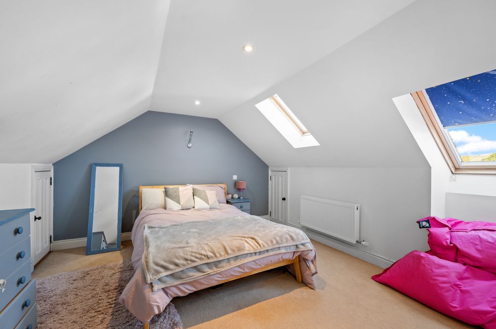 Set at the top of the house is another fine double bedroom. Tremendous in size it takes its natural light from two large Velux windows. The room is tastefully decorated with a punch out of colour used in the back wall. Storage within the eves.