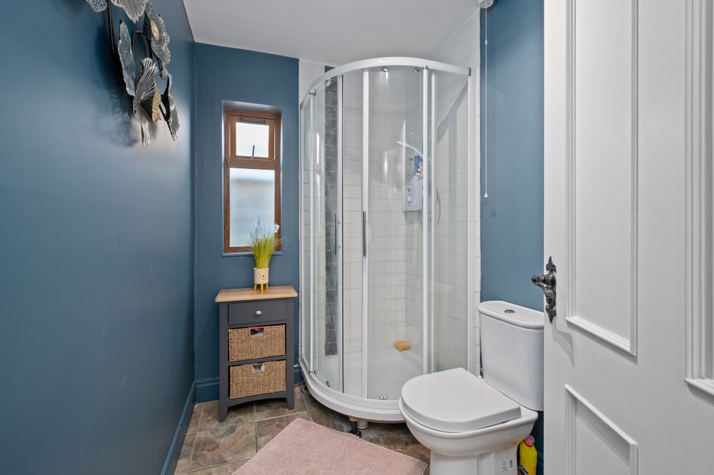 Located off the reception hall is a fine family bathroom. Finished with three piece white bathroom suite to include fully tiled shower cubicle, pedestal sink and WC the bathroom has fully tiled floor. Painted in a deep navy the white suite stands out. A gable window takes care of natural light and ventilation.
