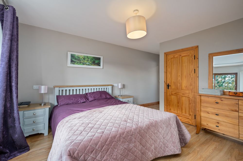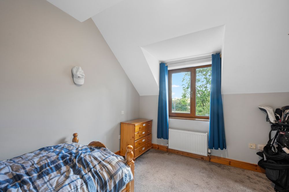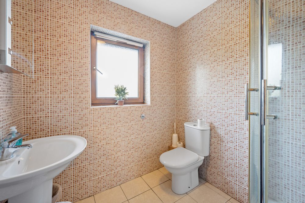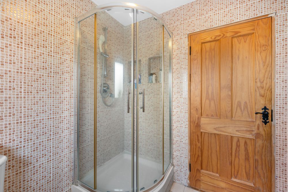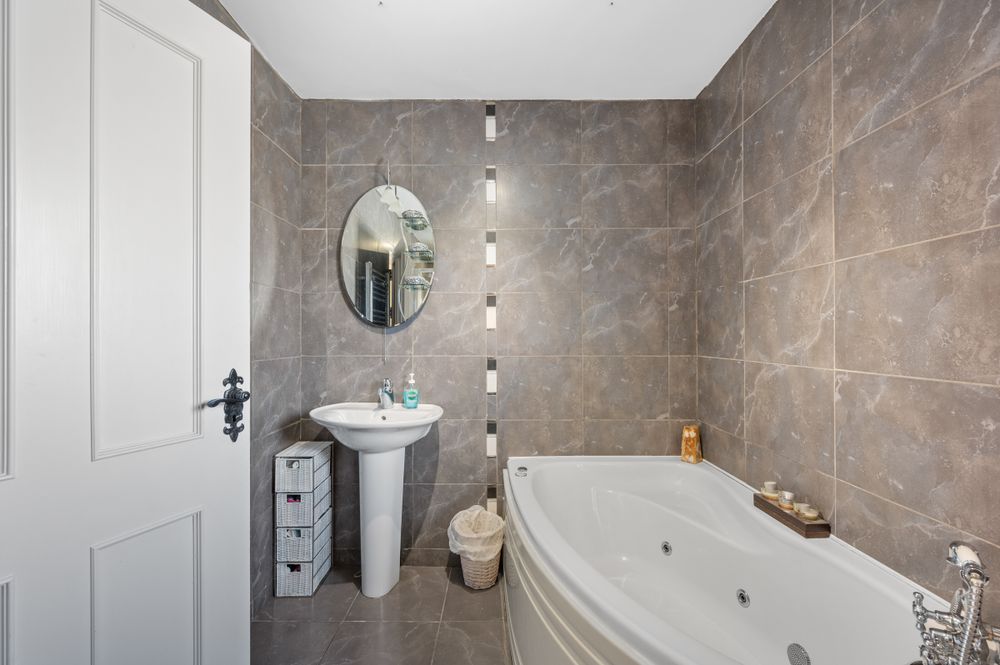 This family bathroom is located at the first floor level. This room is tremendous in size and easily takes the four piece suite fitted here. Included is a corner Jacuzzi bath, an enclosed and fully tiled shower cubicle, pedestal sink and WC. The room is tiled from top to toe in a quality neutral tile with punch out border. Heated towel rail. Vanity mirror with light fitted over the wash hand basin. Gable window for natural light and ventilation. Access to hot press offering extra storage.