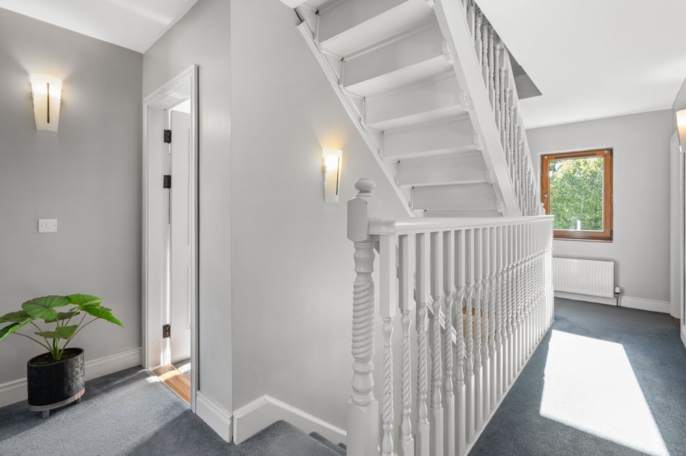 The staircase of this home is finished with carpet softening the access to the first and second floor. The handrail, newel posts and spindles are painted in a complimentary tone to that on the walls. The landing is treated to a continuation of the same carpet and colour pallet.