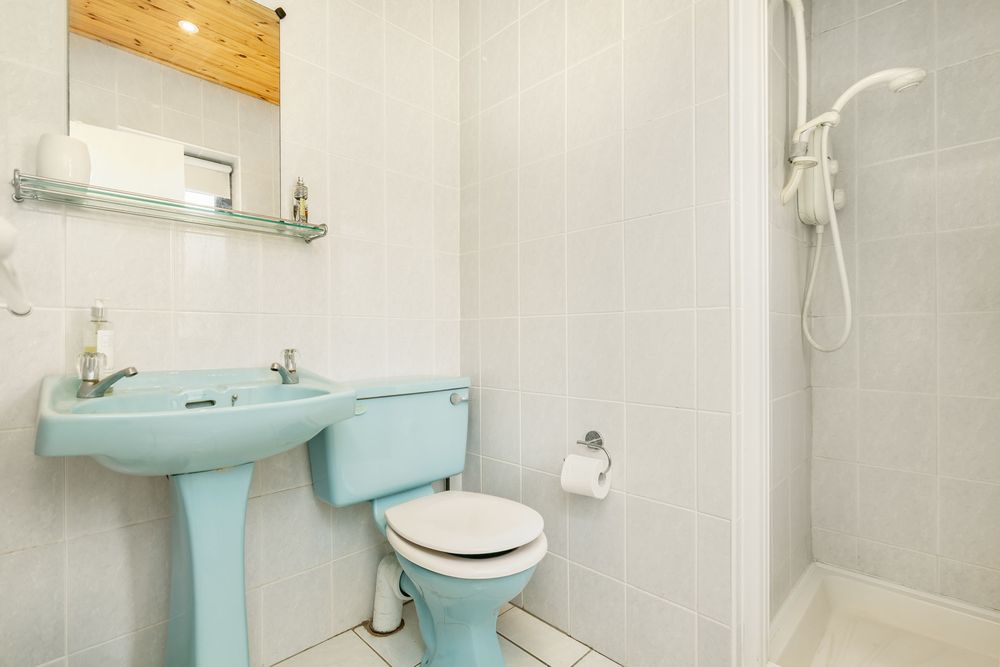 Fully tiled and includes WC, WHB and has a pumped shower fitted.