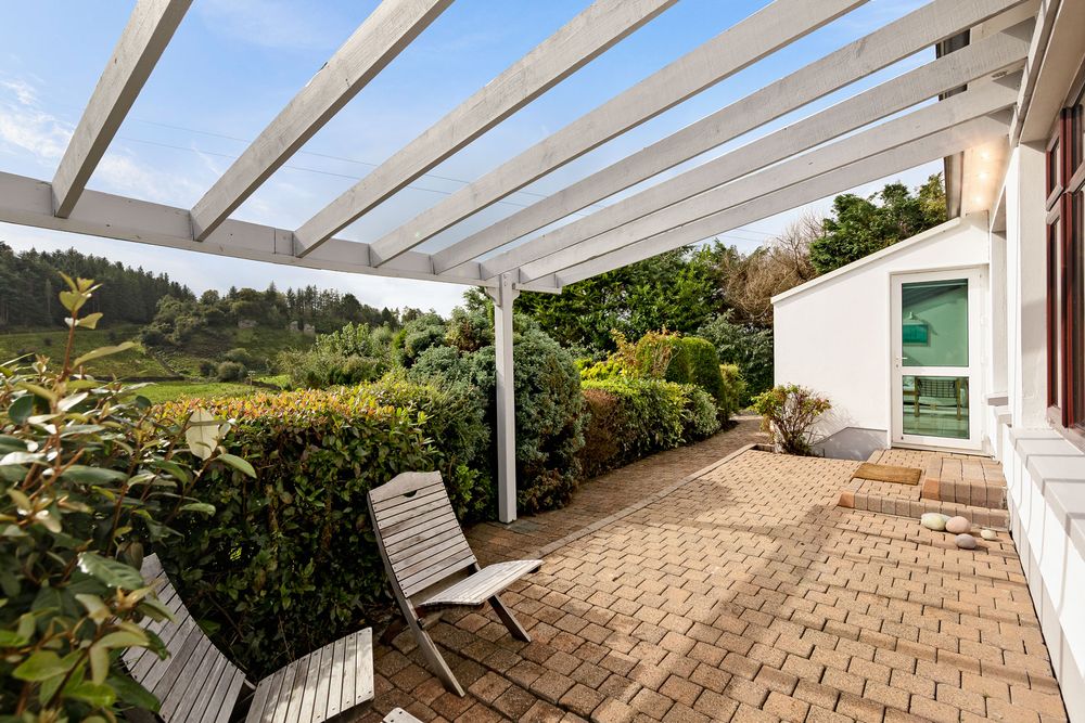 The driveway rises as you enter the property and the property has been beautifully screened with a hedgerow to the front and maturing trees and shrubs around the driveway. The owners have made the property really nice and private and there are mature lawns and a brick paved entrance patio to the front door and across the front patio.