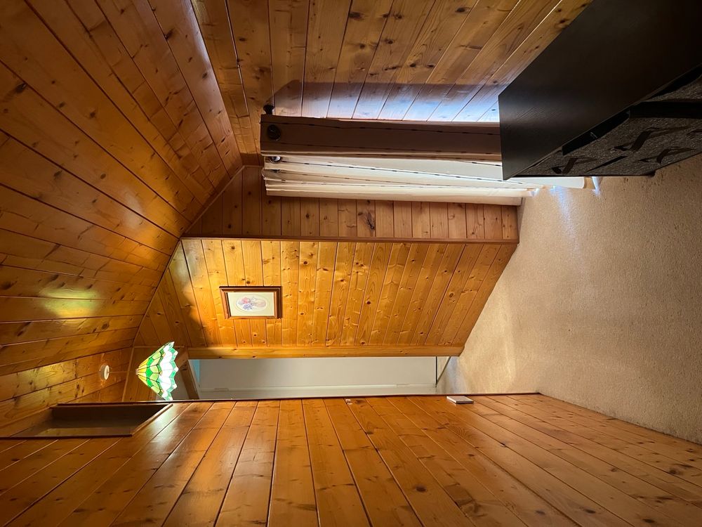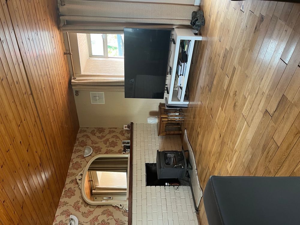 Solid timber floor, brick surround fireplace with solid fuel stove, exposed timber ceiling, storage. Door to,