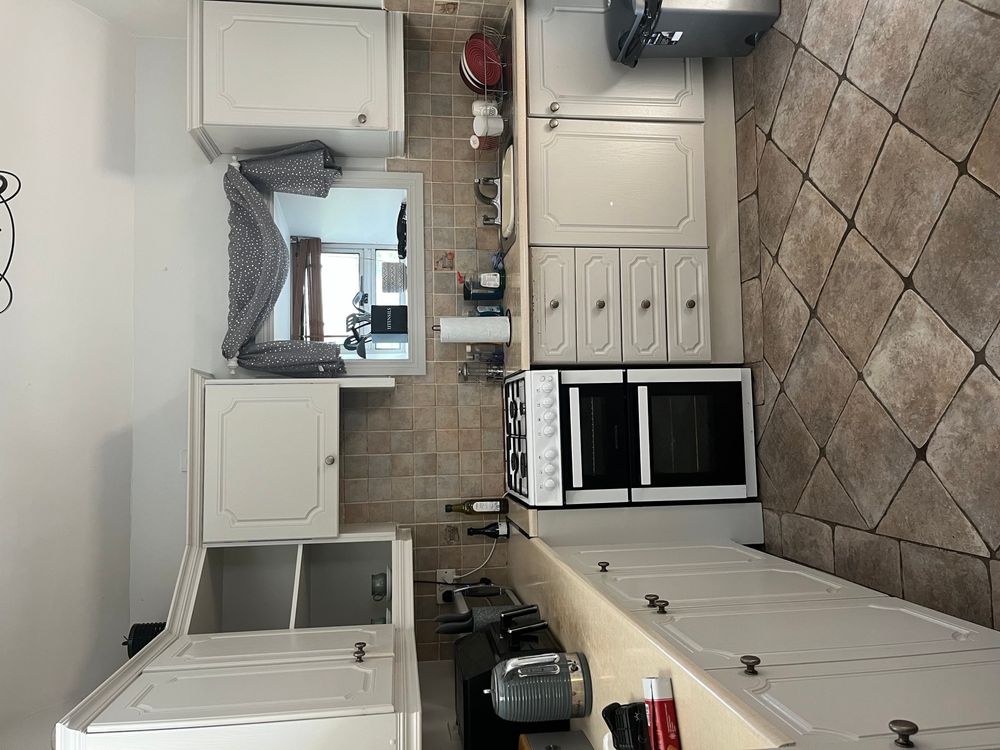 Built in units at eye and floor level, tiled splashback, tiled floor, dual aspect windows. Gas oven with gas hob