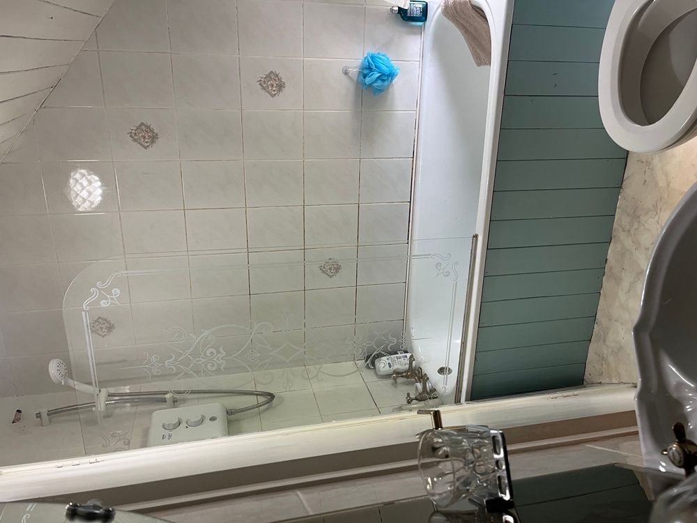 Tiled walls and floor, timber panelling on bath, Wc, Whb, Electric T80 shower