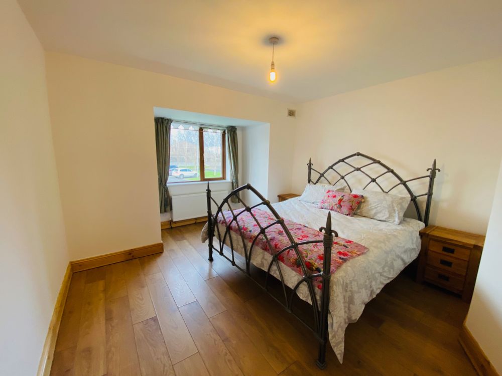 Double bedroom with oak effect laminated flooring, bay window, roller blind 7 light fitting.