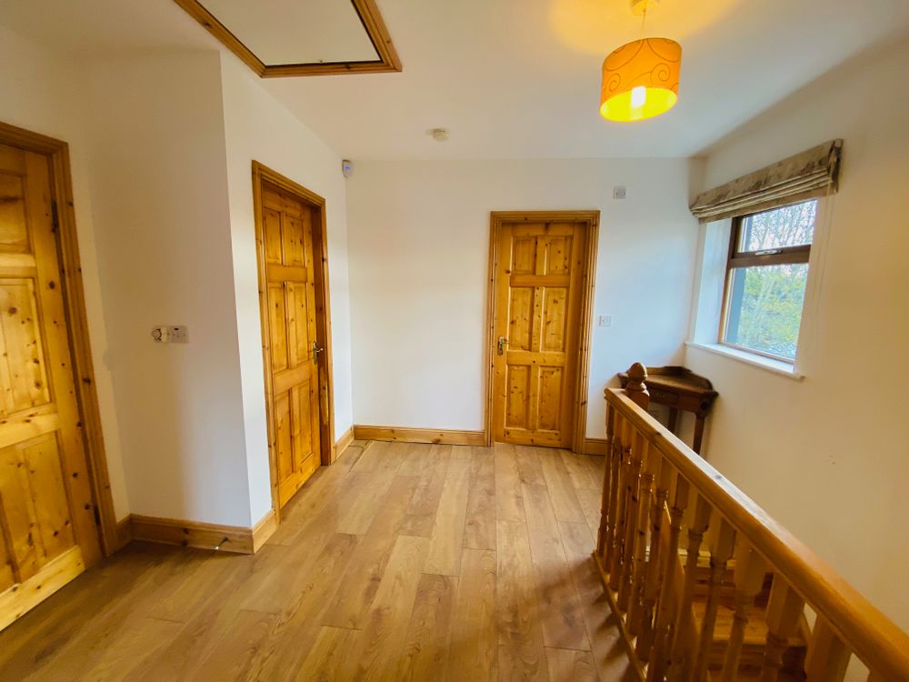 Oak effect laminated flooring, roller blind, light fitting, hot press and staire access to attic.