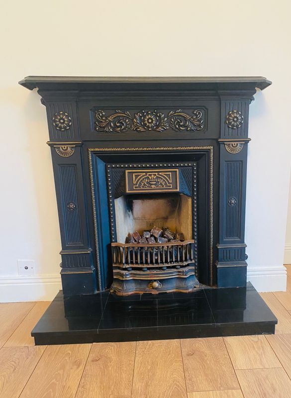 Oak effect laminated flooring, bay window, Ornate fireplace with gas fire and marble hearth, light fitting, roller blind.