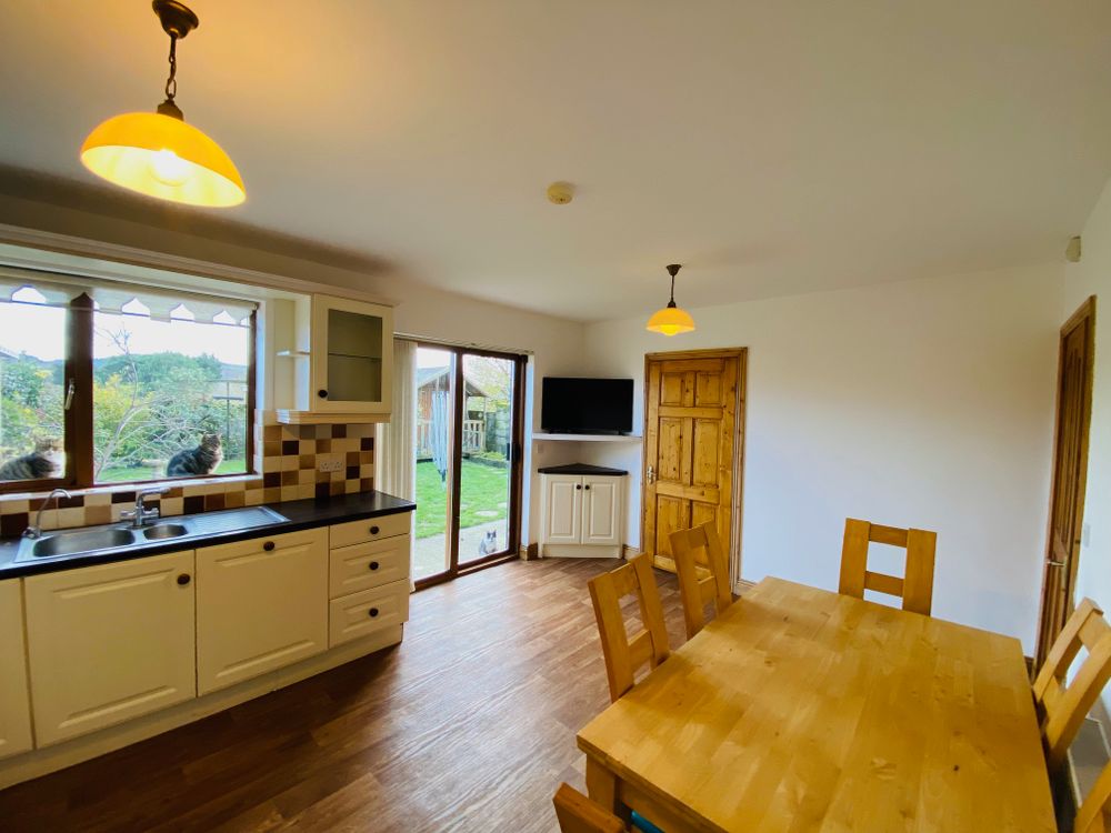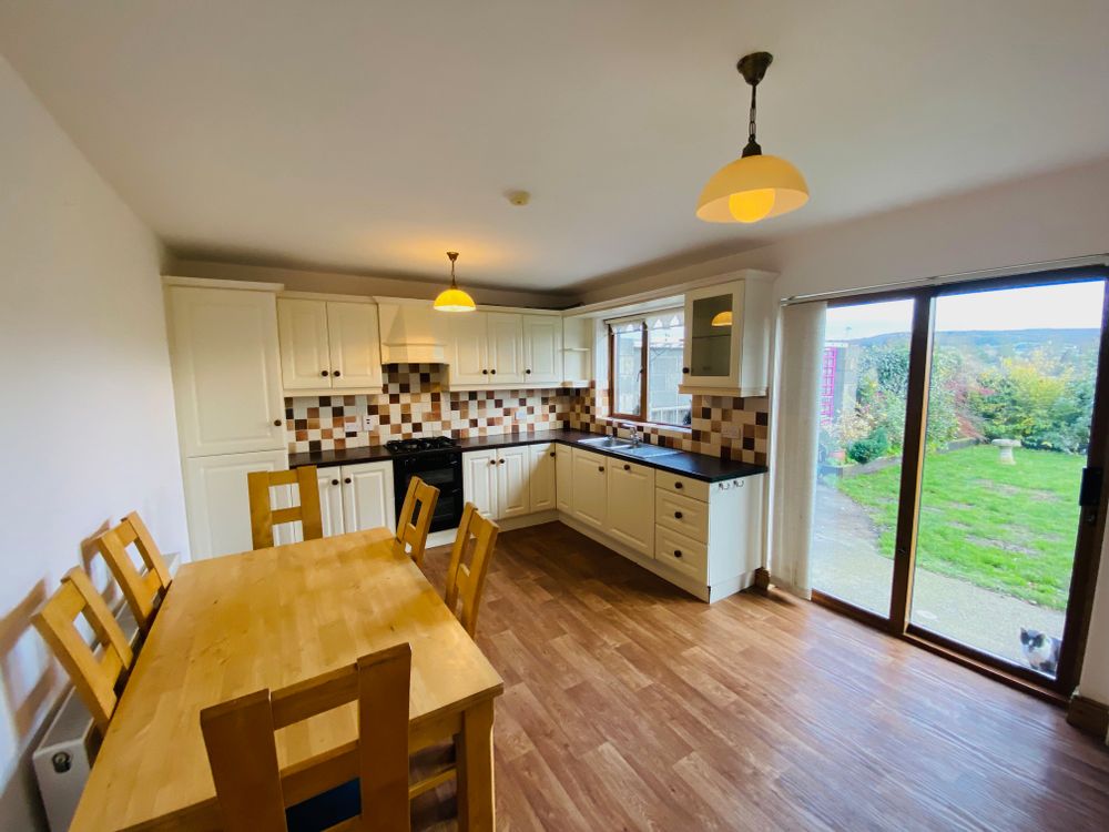 The kitchen / dining room is complete with country style cabinetry and benefits a generous adjoining utility room and guest WC, while the separate living room benefits a feature fireplace with natural gas fire insert.