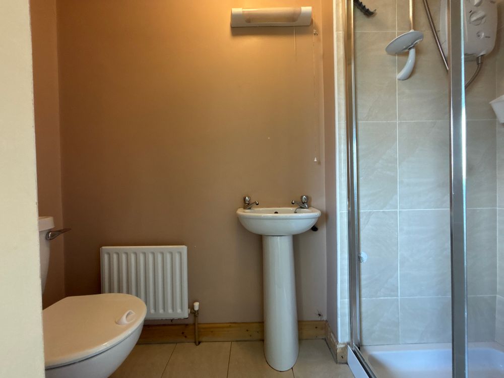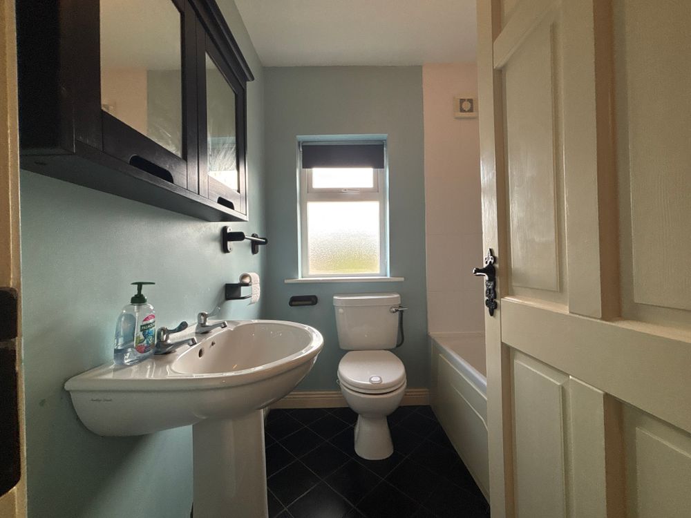 Tiled flooring, W.C, W.H.B, Bath and shower.