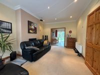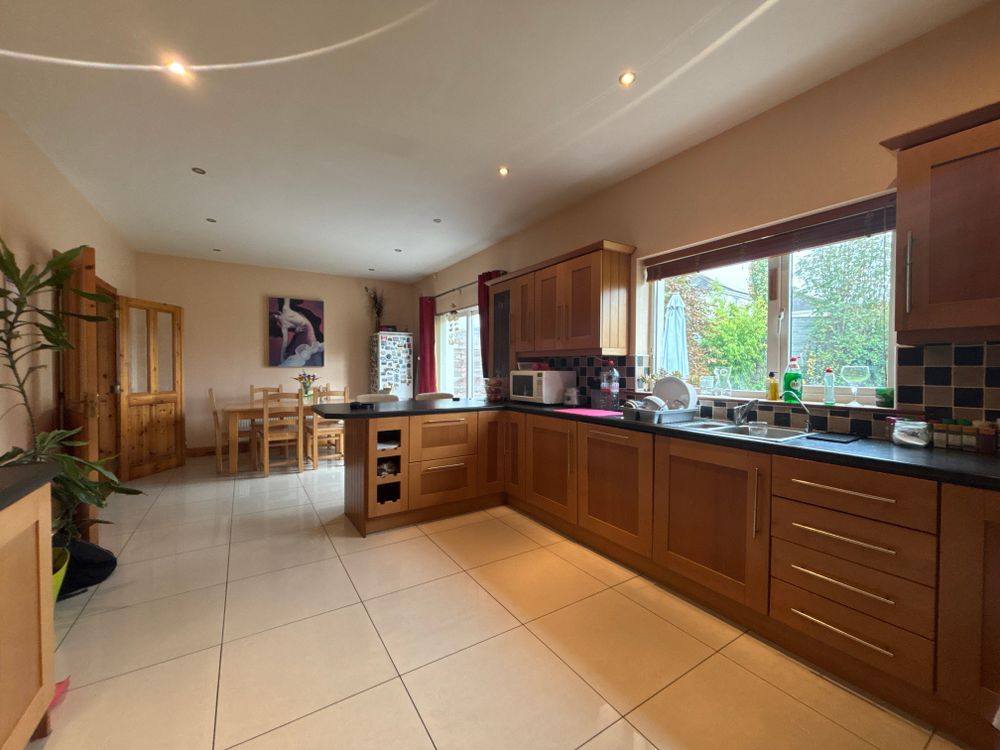 Tiled flooring and backsplash along with units at eye and floor level and integrated appliances. you have double doors to the sitting room and sliding doors to the rear patio and garden.
