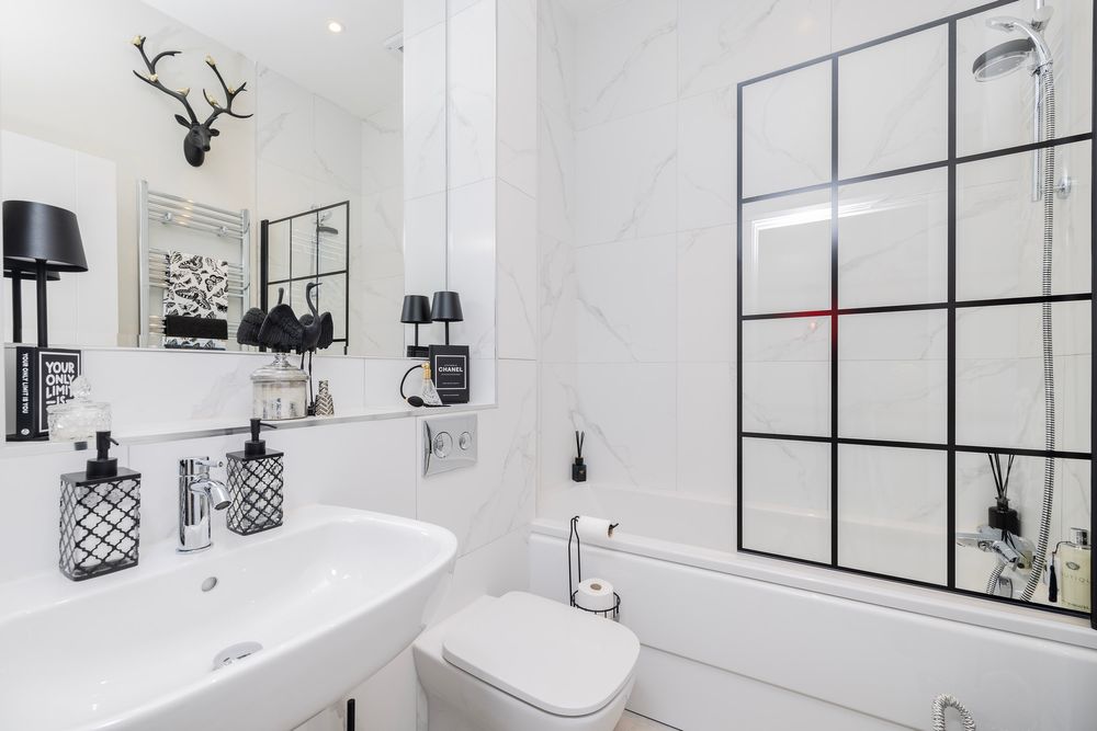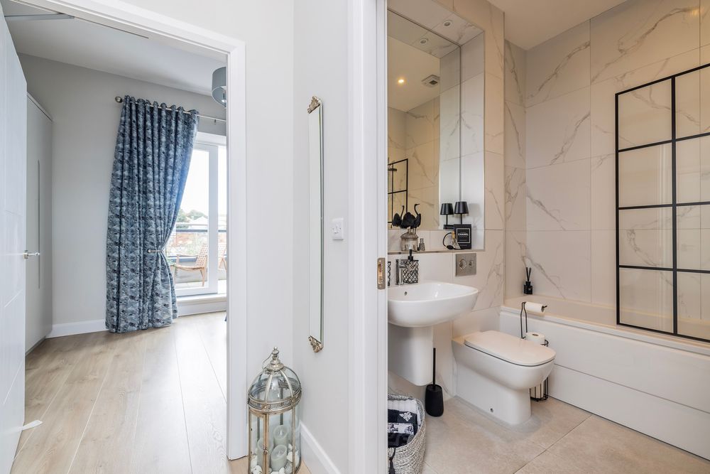 This luxurious bathroom is presented with stunning marble tiling and high quality sanitary ware including wc, wash hand basin and bath with shower facility protected by a stylish glass screen door. A large recessed plasma mirror adds to the sense of space and a cosy chrome plated heated towel rail keeps the room lovely and warm.