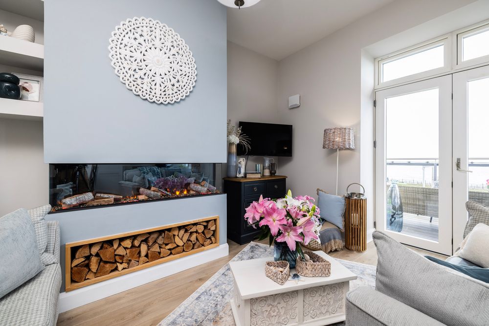 The kitchen features an excellent range of bespoke cabinetry including wall and floor units topped with beautiful quartz countertops with a contemporary glass splash back offering a unique and modern solution which keeps maintenance to a minimum. A glazed display unit provides further storage. The kitchen also includes an integrated fridge freezer, dishwasher and a built in oven with induction hob and extractor fan overhead. The home has a new combi gas boiler, a single, high efficiency unit that provides both central heating and on demand hot water for the home. The wonderful living space is centred around a contemporary custom built integrated eye level electric fire, creating a warm and homely feeling.