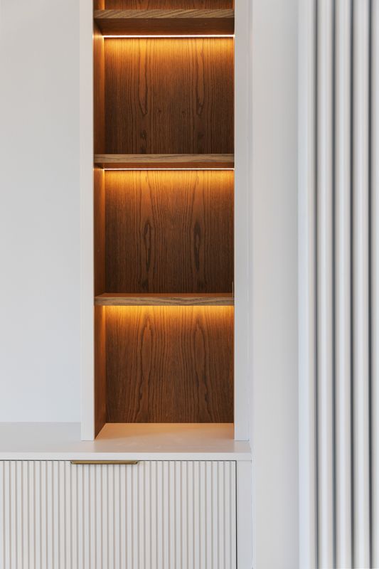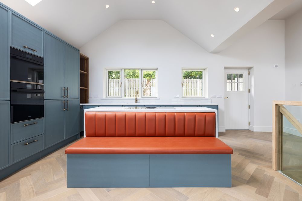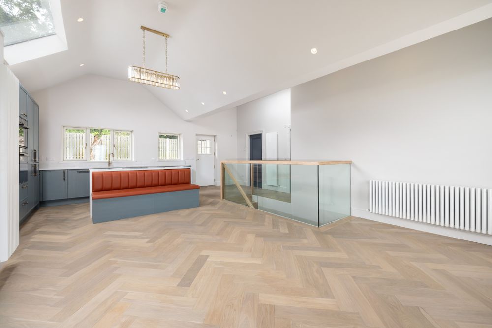 Fantastic open plan living space offers an abundance of room for designated cooking, dining and living room areas. The room is light filled with large roof windows flooding the room with natural light. This is truly the heart of this wonderful home with the kitchen featuring an excellent range of bespoke custom built cabinetry finished to the highest standard offering floor and wall units with integrated fridge freezer, refuse unit, built in Hotpoint oven and microwave and topped with beautiful quartz countertops. An island unit features further storage and is home to a Whirlpool induction hob with extractor fan plus a dishwasher, again the island is finished with wonderful quartz countertops, and additional feature here is a built in bench. The sense of wonderful craftsmanship is continued into the living room area which features a bespoke handcrafted entertainment unit, the perfect home for your tv while providing additional storage and display shelving. The entire is floored seamlessly with stunning herringbone timber flooring adding to the sense of light and space. A door here leads to the private landscaped garden.