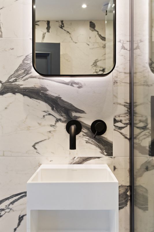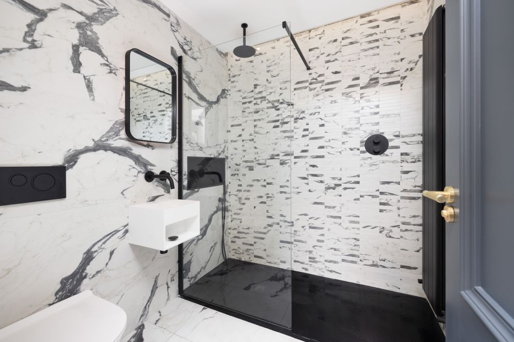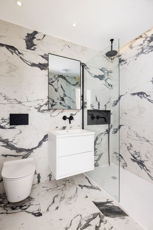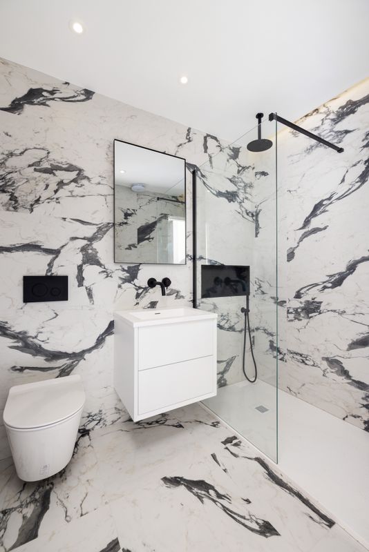 This luxurious shower room featuring stunning porcelain tiles, wc, wash hand basin and a most impressive large shower facility with a tropical shower overhead.
