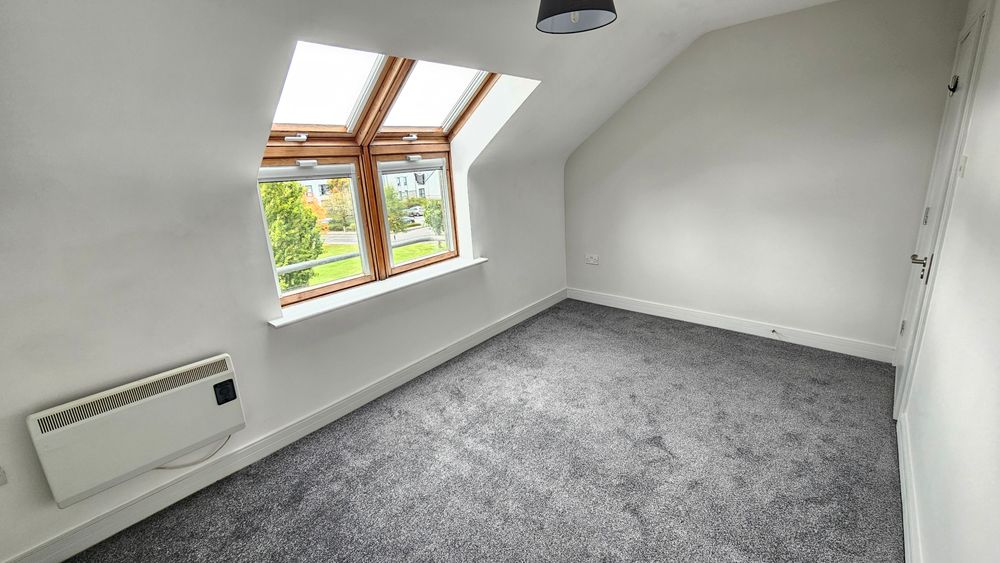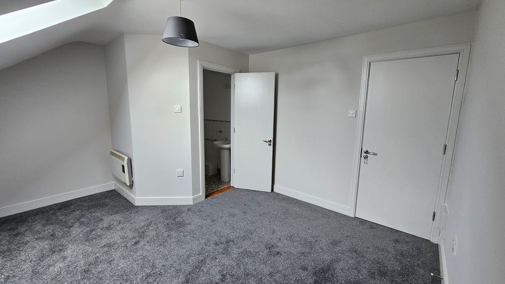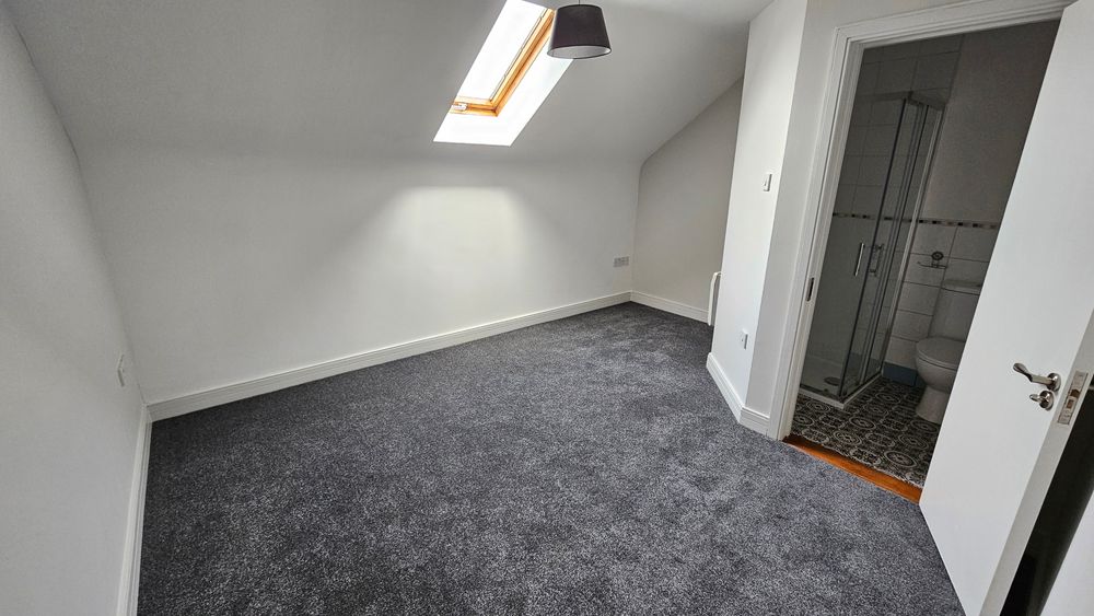 Situated at the front of the apartment with a large window/roof window overlooking the green area to the front, this bedroom is newly finished and is very spacious. Ample space for a queen size bed and other furnishings.