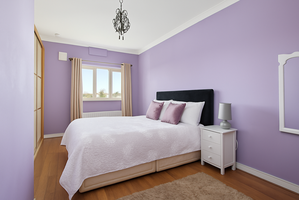 Built in wardrobes, ceiling light and engineered walnut wooden floor.