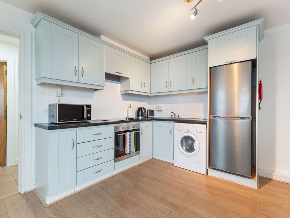 Finished with a laminate wood flooring, fully fitted kitchen, this is a beautiful corner space and it opens out onto a large penthouse balcony which is south west facing to the side. This kitchen/dining/living space has excellent natural light with extensive glazing on both gables.