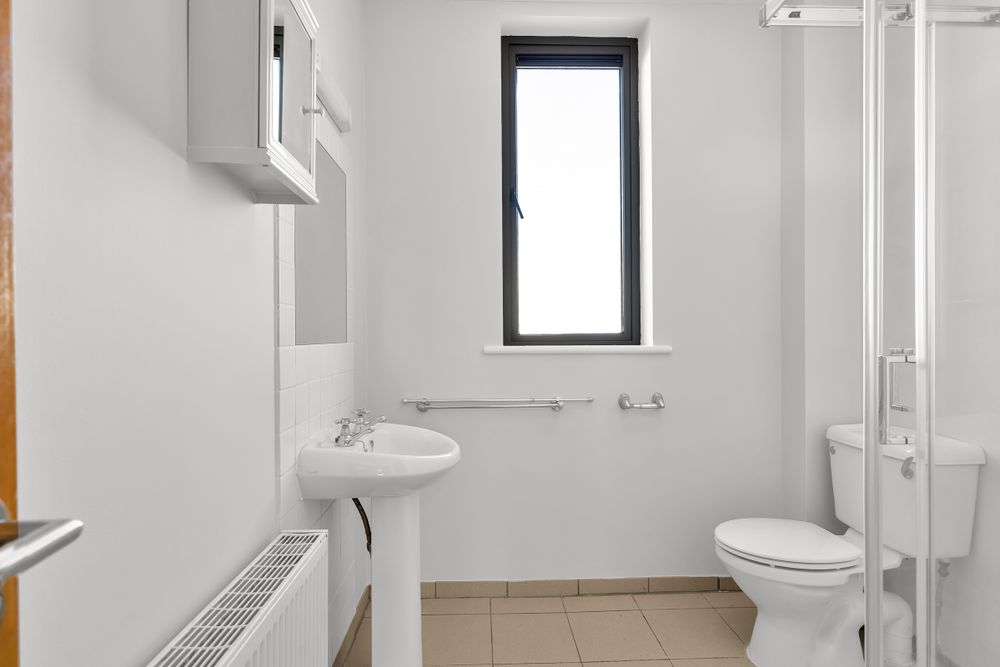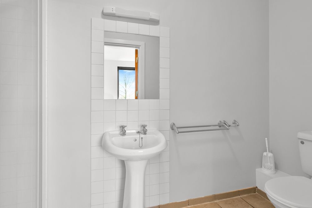 with w.c., w.h.b. & shower. Tiled floor and shower cubicle.