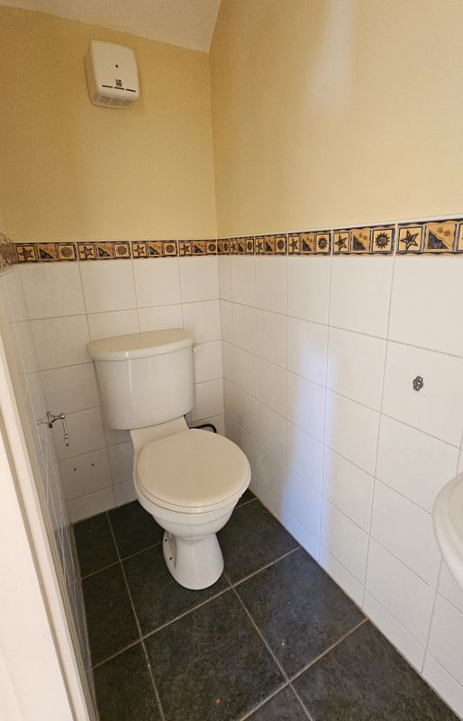 Downstairs wc with whb, mirror, half tiled walls, tiled flooring.