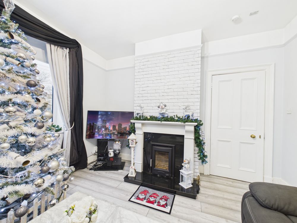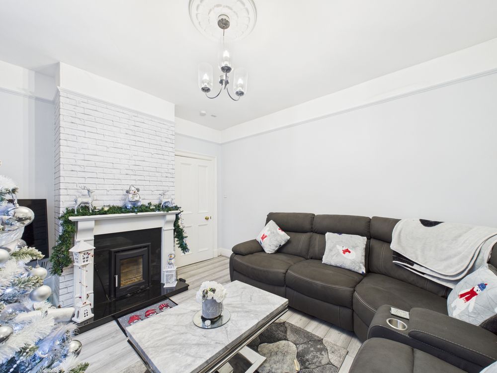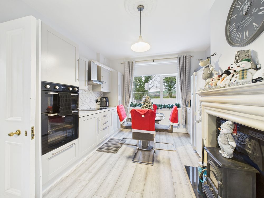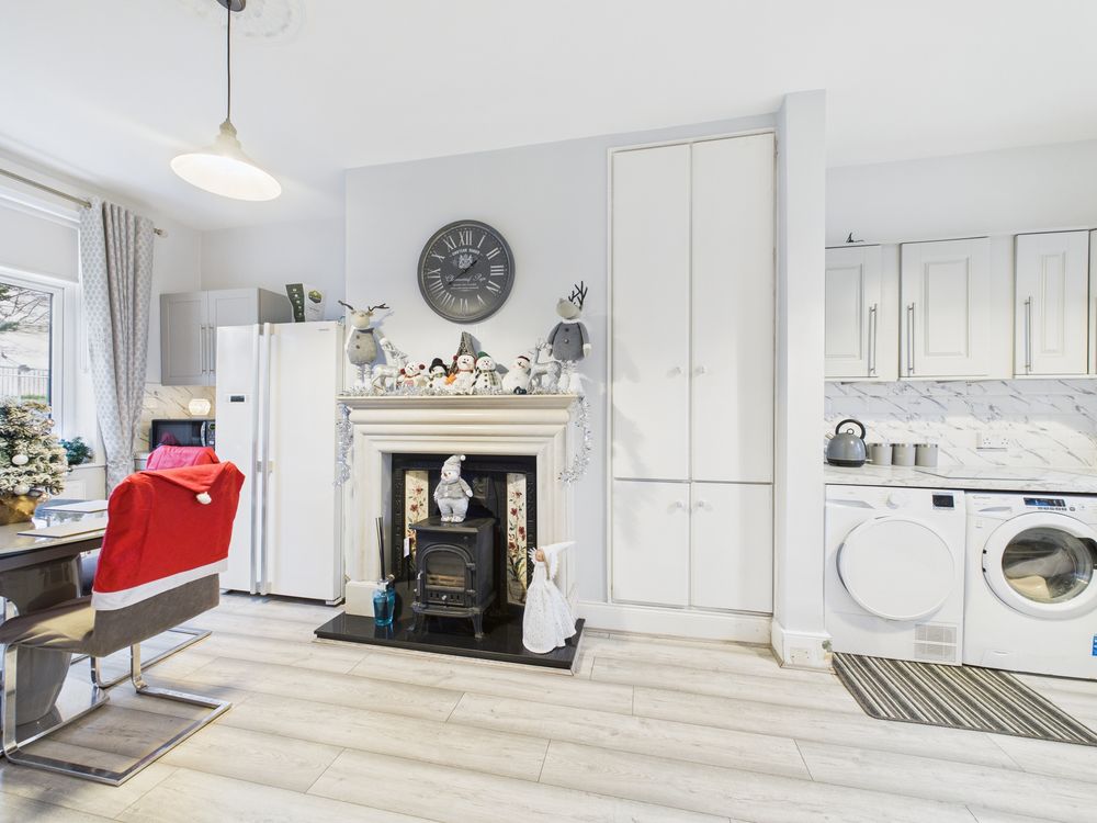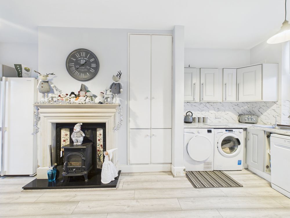 Quality flooring throughout, feature fireplace with stove in living room, feature fireplace in kitchen, contemporary fitted kitchen with exceptional storage to include all integrated appliances & high end sanitary ware and tiling in the main bathroom.