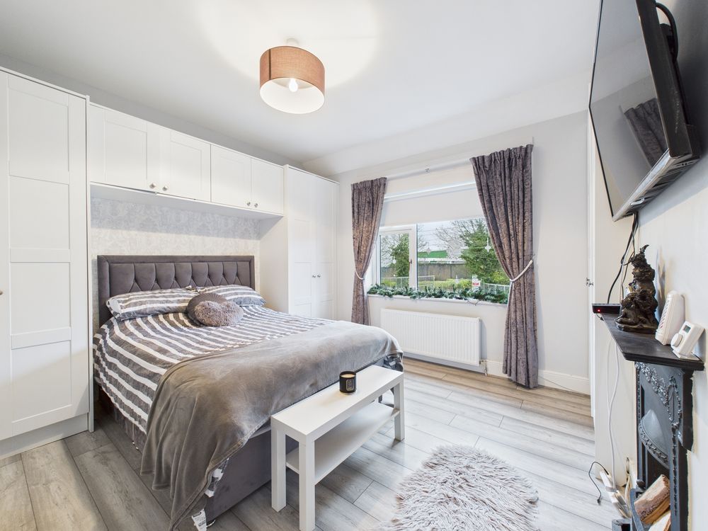 Outside there is a lawned front garden with side entrance on one side and large space to the other side together with driveway leading to large lawned rear garden.
