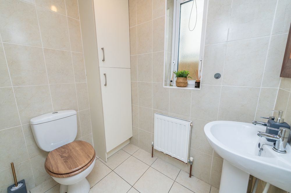 Fully tiled, storage press, w.c and w.h.b.