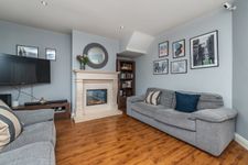 Sandstone electric fireplace, laminate flooring.