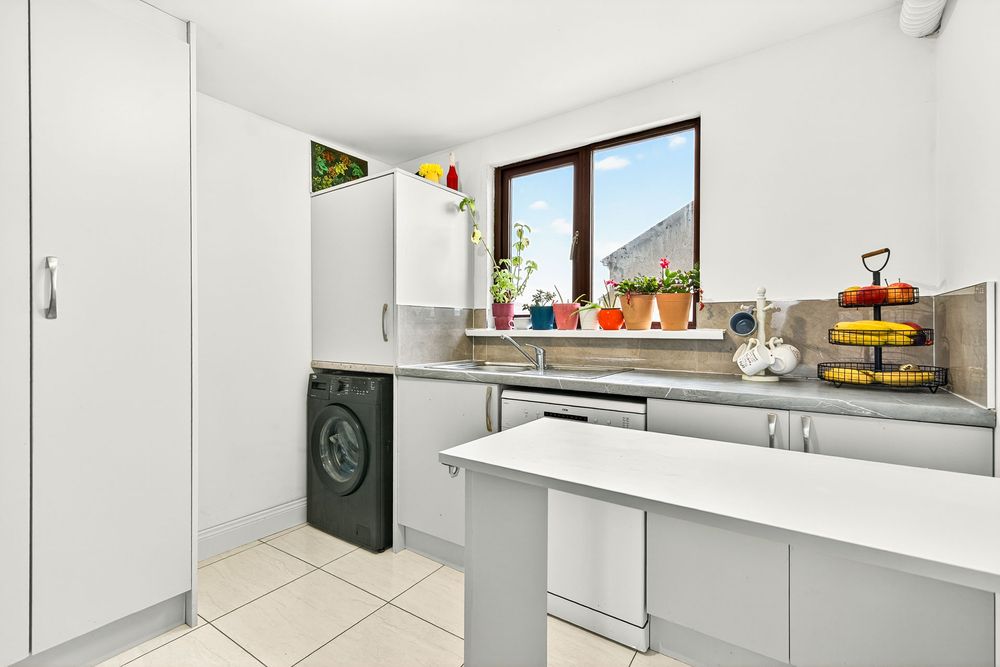 Tiled floor and splashback. Plumbed for washing machine and tumble dryer. Storage cupboards. Built in ironing board.