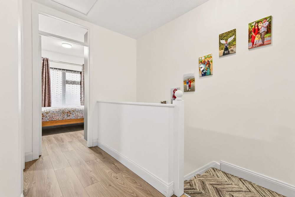 Tiled flooring with wooden staircase and carpet flooring. Decorative radiator covers.