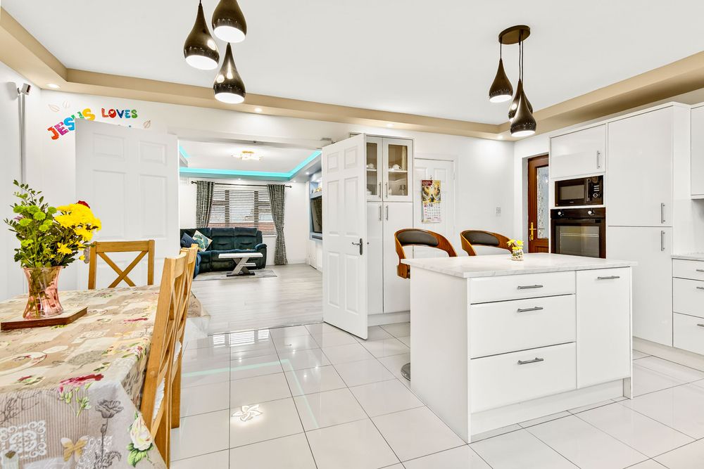 Tiled flooring. Recess lighting. Fully fitted kitchen with decorative splashback. Integrated appliances. Breakfast bar/ island. Sliding door to rear garden.