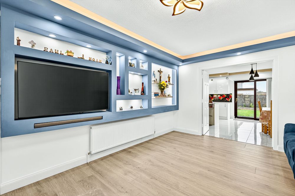 Laminate flooring. Feature electric fireplace. Custom built in shelving. Double doors to kitchen/ dining room. Feature LED recess lighting.