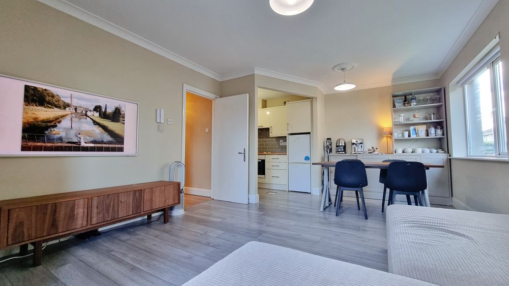Living/Dining: c. 5.50m x c. 3.85m with patio doors to balcony, laminate flooring Kitchen: c. 2.80m x c. 2.25m with white fitted units, tiled walls and laminate flooring.