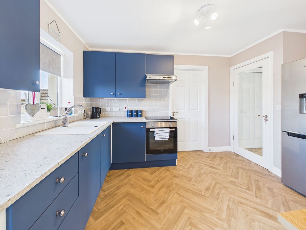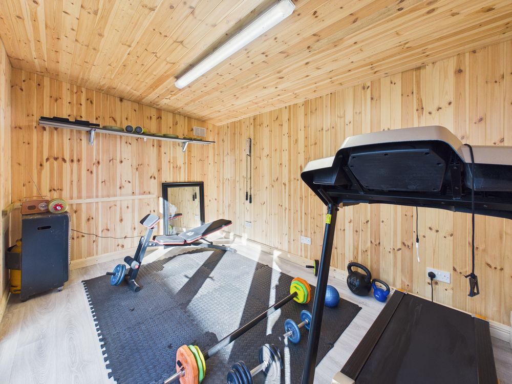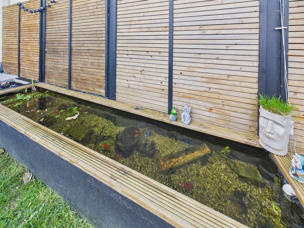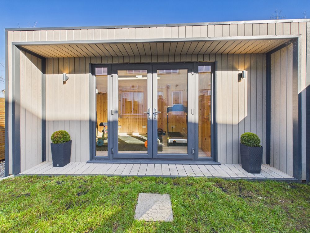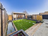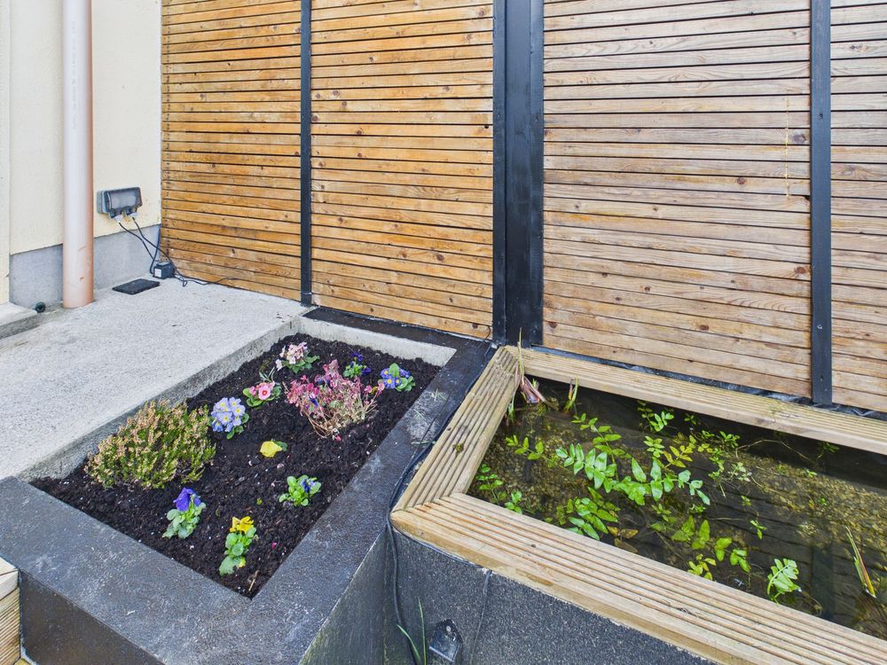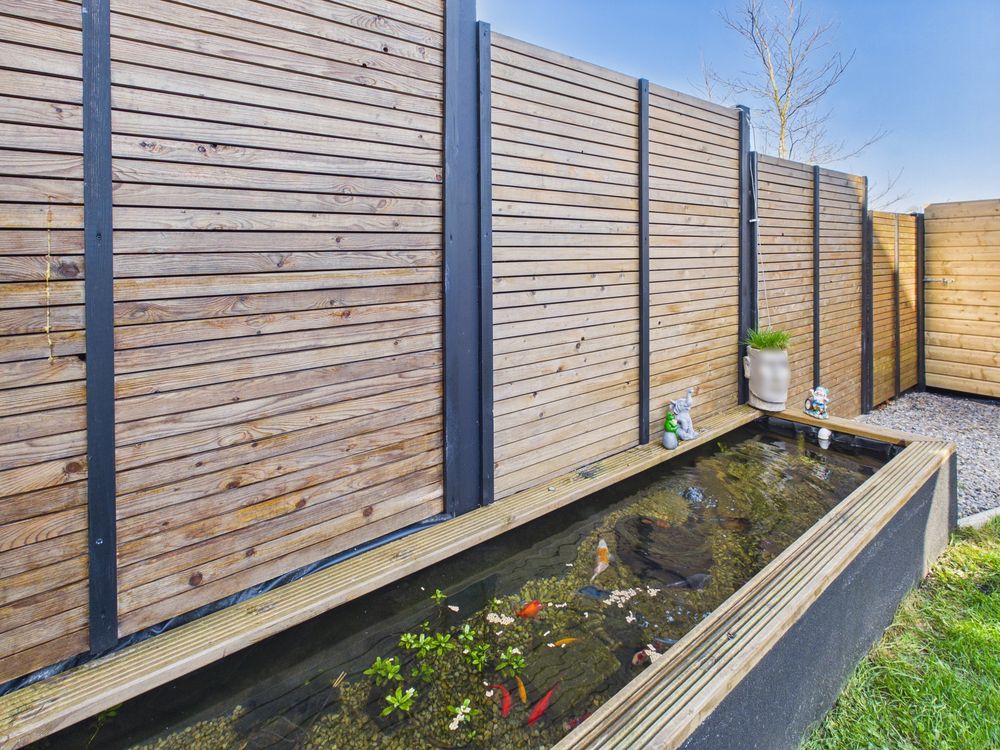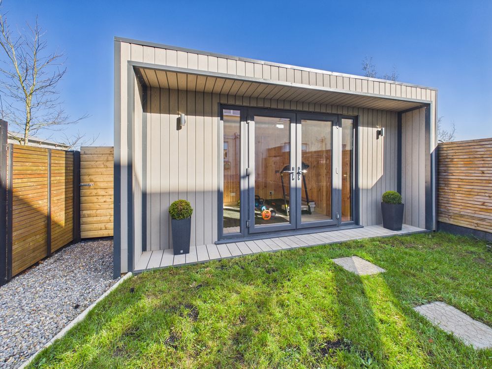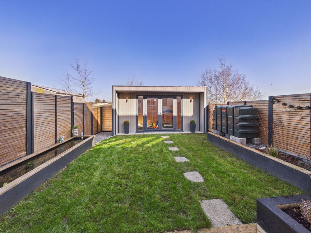 To the rear of the property is a beautifully maintained garden space with timber panel fencing, raised flower beds, a fishing pond and stepping stones that lead to an attractive garden studio built by Connaught Garden Studios, which is fully insulated and fitted with four double sockets, making it suitable for a variety of uses including a home office, hobby space or studio. To the front of the property there is a tarmacadam driveway providing convenient off-street parking.