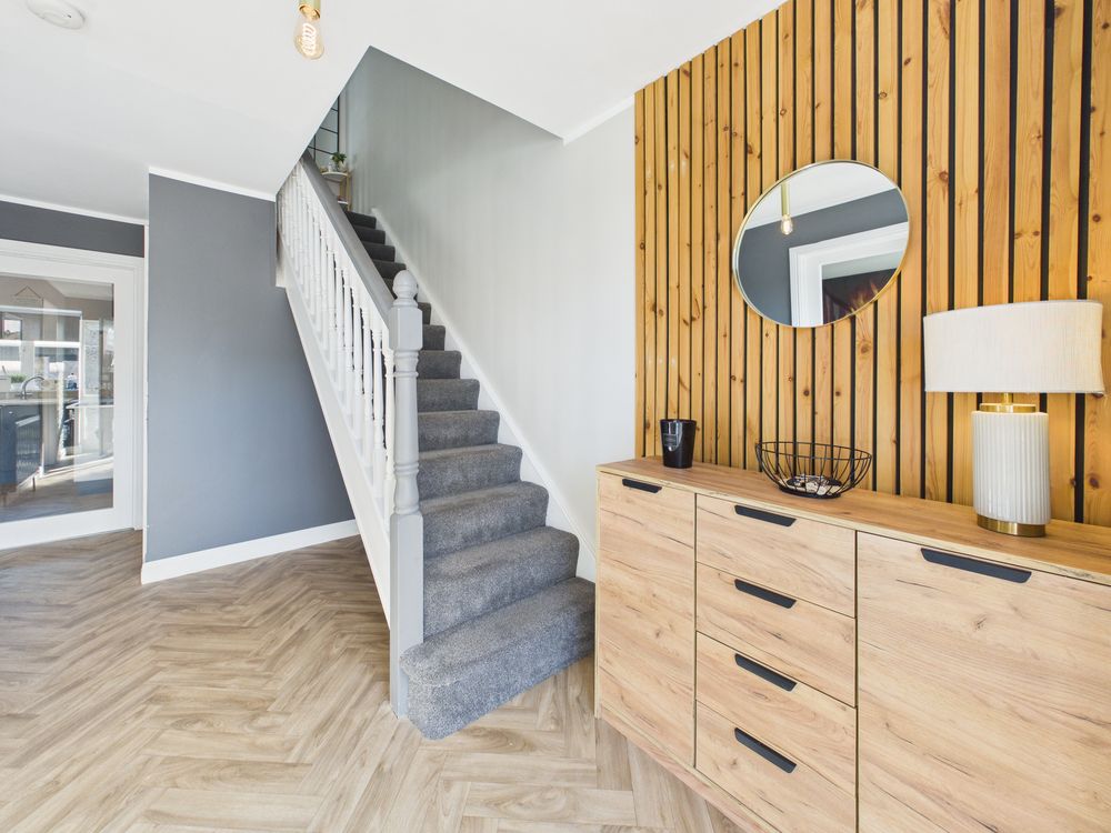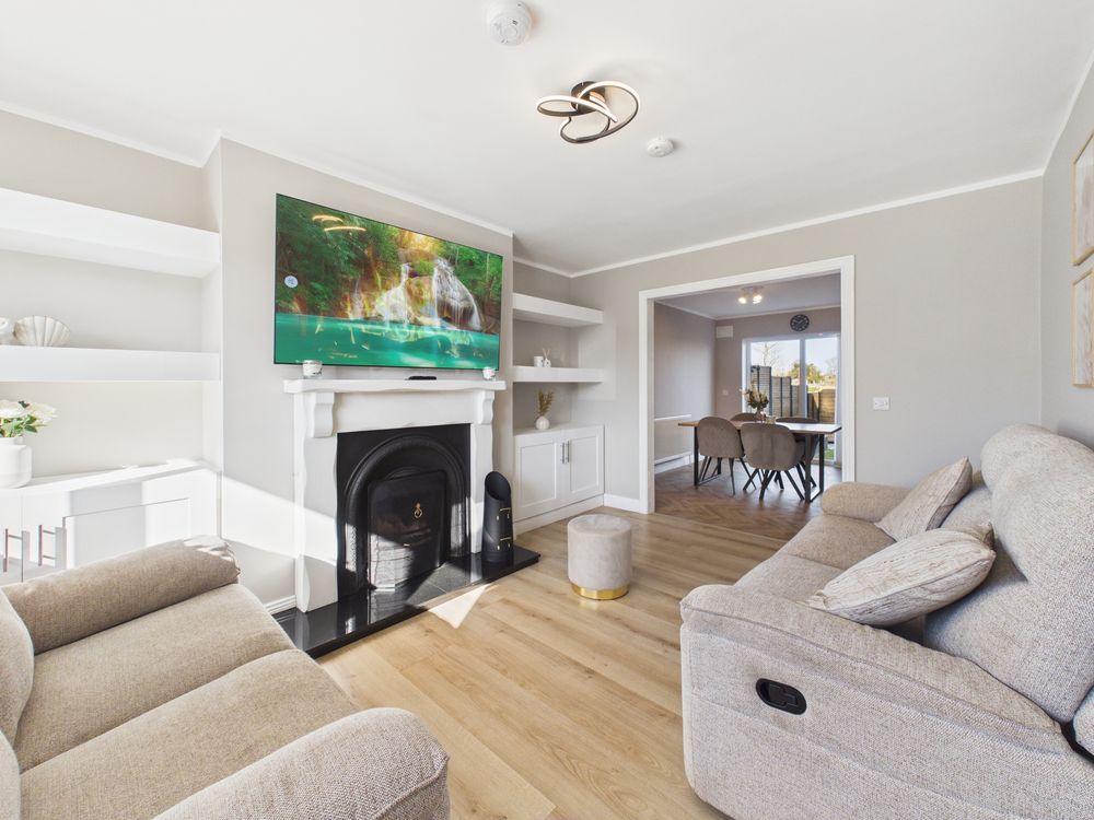 The property was fully renovated by the current owners in late 2024 to a very high standard and boasts a BER rating of B3, offering excellent energy performance and comfort throughout. Accommodation comprises a welcoming entrance hallway with attractive feature timber panelling, a bright open-plan kitchen and dining area with double sliding doors leading to a wonderful rear garden, and a well-presented sitting room with an open fire and beautiful display areas on either side of the fireplace, while large windows allow a natural flow of light into the room. A utility room provides convenient laundry facilities and additional storage space, and a guest W.C. completes the ground floor. Upstairs there are three bedrooms, one of which benefits from an ensuite, along with a well-appointed family bathroom.
