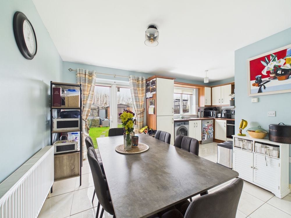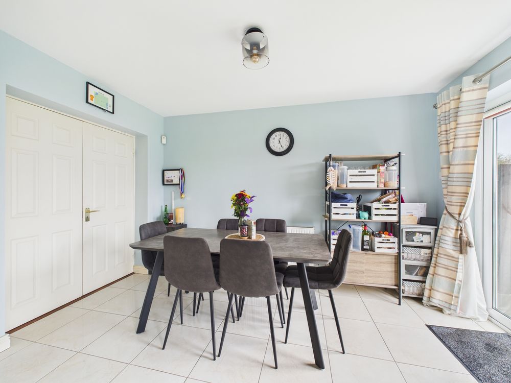 Step inside the front hall and the attention to detail and stunning decor will immediately impress. With its wood floors and beautiful decor the tone is set for a house of exceptional qualities. The beautiful sitting room with its large picture bay window, enjoys quality flooring and a marble fireplace complete with inset stove, which combine to create a room of great character and harmony. Double doors create an optional open plan layout and lead to the kitchen dining room. The light filled kitchen dining room is wonderfully appointed and comes complete with bespoke cabinetry, attractive tiling and recessed lighting. This room with its large double patio doors is perfect for family mealtimes or just a relaxing coffee overlooking the peaceful garden.