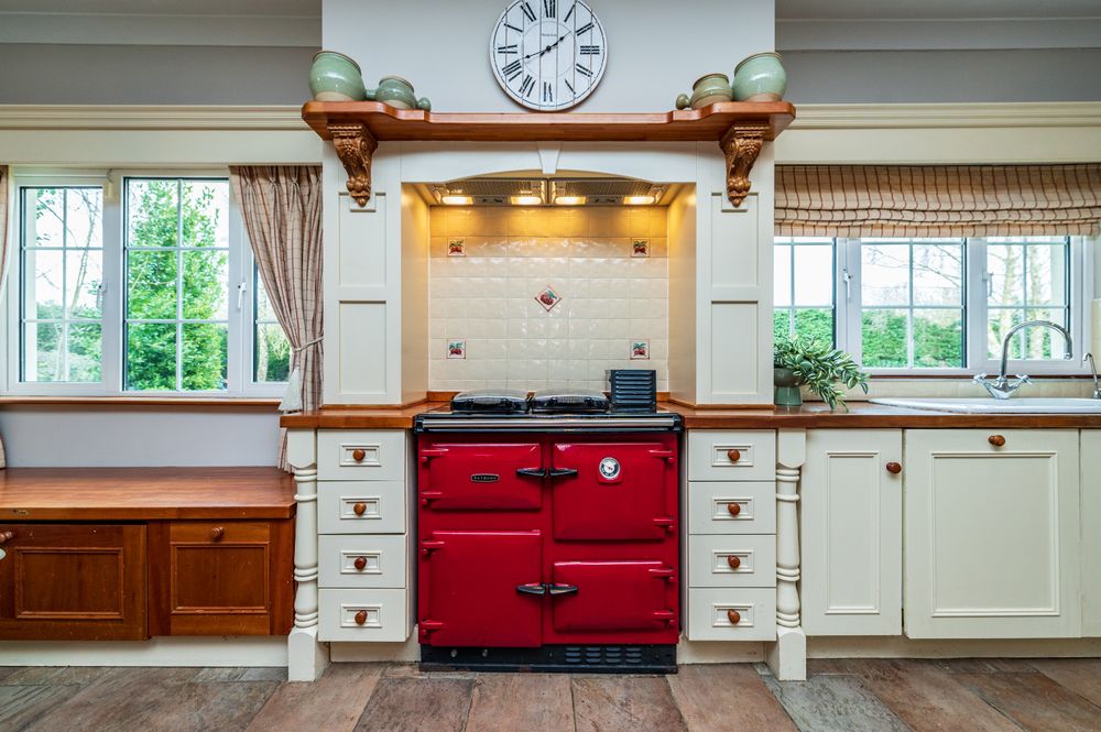 tiled floor, cream built in ground and eye level presses, brick chimney breast with open fire, window seat, ceramic sink, island unit with granite worktop, coving, recessed lights, Belling integrated dishwasher, Rayburn oil cooker, extractor, integrated fridge/freezer, double doors leading to: