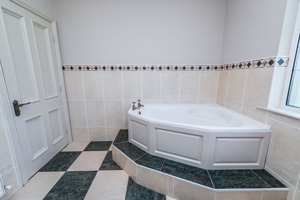 w.c., vanity w.h.b., jacuzzi corner bath with shower attachment, recessed lights, heated towel rail and shower