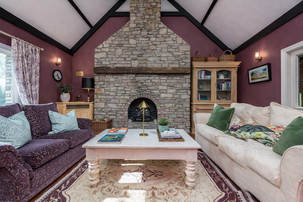 wooden floor, vaulted ceiling, stone chimney with open fire, wall lights, French doors and double doors leading to