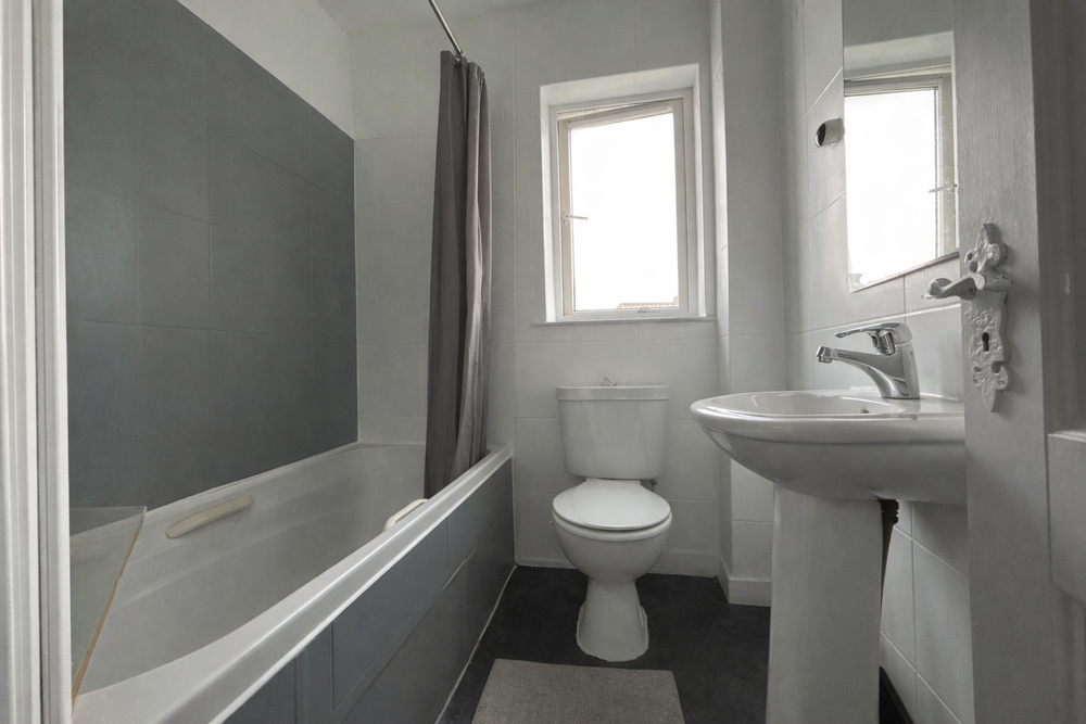 Laminate flooring with tiled walls. W.C, W.H.B, bath and shower.