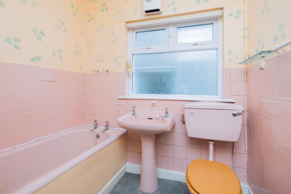 Bright spacious family bathroom with original coloured three piece suite and part tiled walls.